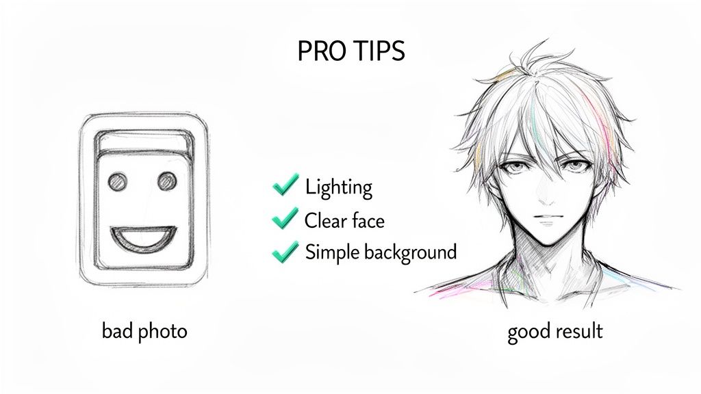 The most critical piece of the puzzle is your source photo. A clear, well-composed image gives the AI a perfect map to follow, letting it capture your unique features and translate them into the anime style you've chosen. When the AI has a great reference, you'll see it in the final product—more detail, more expression, and a result that actually looks like you.